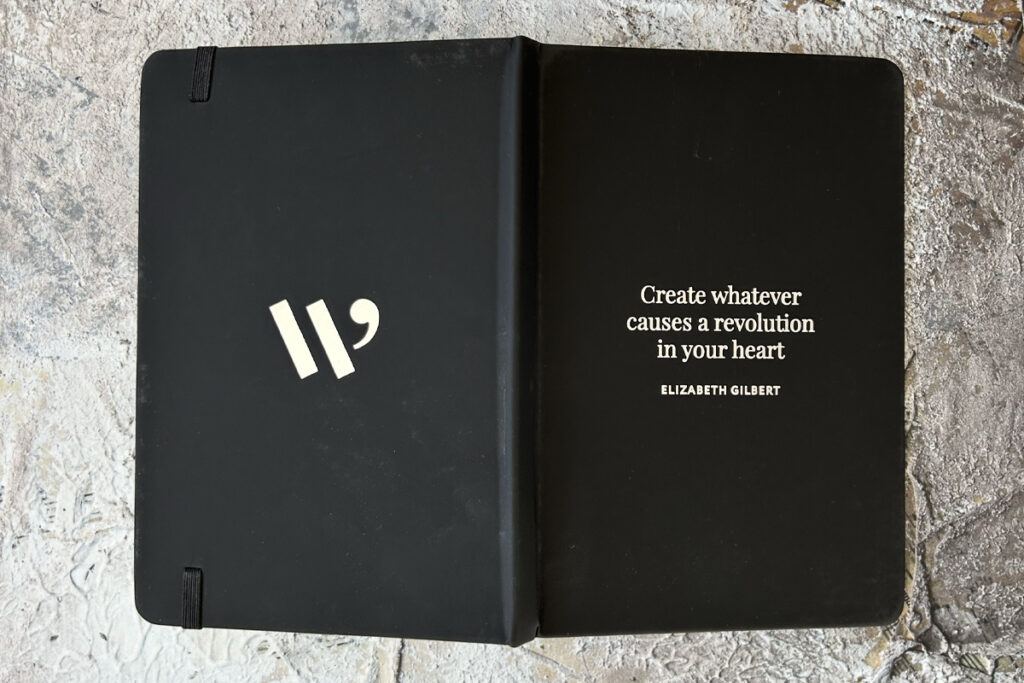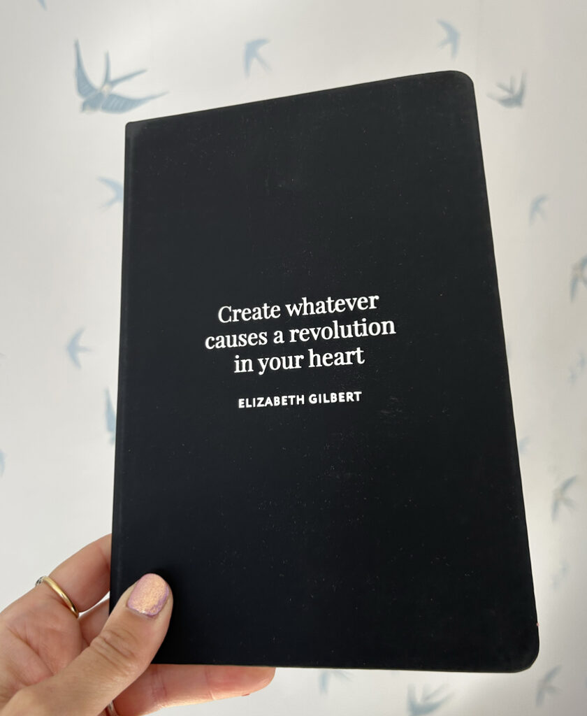Its black cover is elevated by silver-foil typography featuring Elizabeth Gilbert’s evocative quote: ‘Create whatever causes a revolution in your heart.’