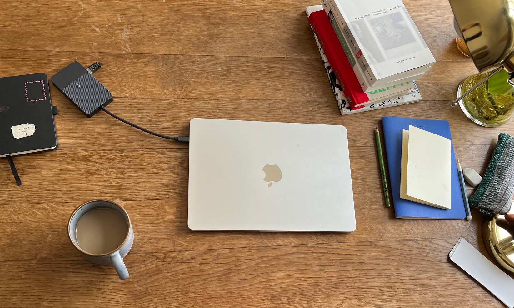 각도가 조절되는 스탠드 조명. 랩톱. 얇은 공책 한 권. 늘 바뀌는 책 서너 권. 여러 서점에서 가져온 책갈피들. 헝겊 필통. 필통 속에는 연필 두 자루, 조그만 연필깎이, 지우개, 세 종류의 펜이 들어 있다.